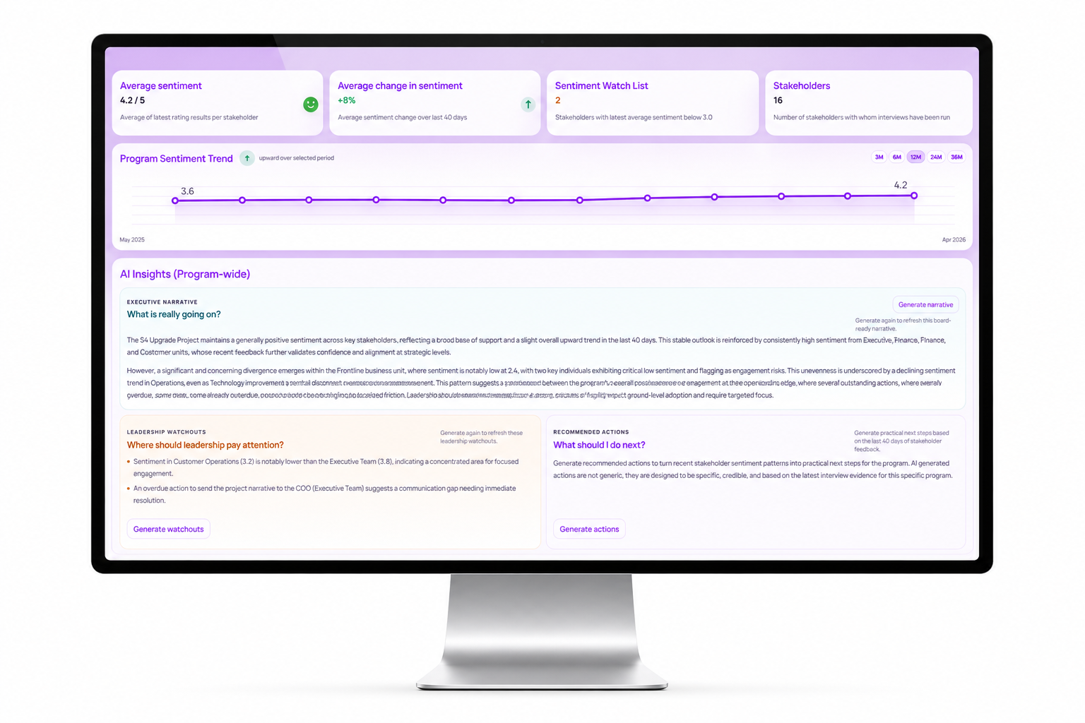 Turn stakeholder input into real-time insight, uncover hidden risk, and get AI-recommended actions to keep your change on track.