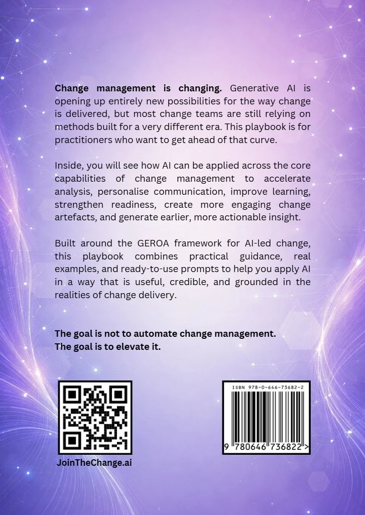 Want to go further? Turn the ideas in the playbook into practical capability with the GEROA™ AI-Led Change training — a self-paced course designed to help you apply AI-led change with confidence and become recognised as a leader in AI-led change. Learn more.